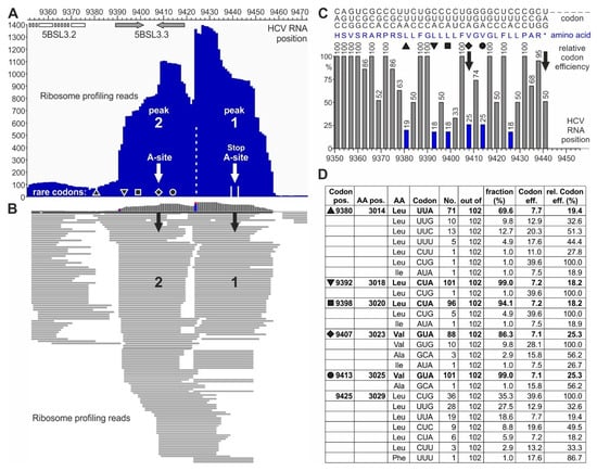 Analysis of the conservation of these codons among HCV isolates from all genotypes shows that those codons, which are in or upstream of the center of ribosome peak 2 (diamond, position 9407), are strongly conserved to be rare codons among HCV isolates (Figure 3D). The codon in the center of peak 2 is conserved to be rare in 86% out of 102 representative HCV isolates from all HCV genotypes and nearly all subtypes []. Even more strikingly, the two rare leucine codons at positions 9392 and 9398—preceding the valine codon in the center of peak 2—are strongly conserved to be rare codons in 101 or 96, respectively, out of 102 HCV isolates. The upstream codon at position 9380 is also conserved to a high extent to be a rare codon. From these findings, we conclude that these rare codons may be conserved for a certain function, perhaps to slow down protein synthesis to give some protein regions enough time for proper folding [,]. For example, during the synthesis of cellular membrane proteins, translation can be slowed down by rare codons to give the signal recognition particle (SRP) enough time to recognize the candidate protein´s N-terminal hydrophobic signal sequence (reviewed in []). In contrast, the codon between the two ribosome peaks at HCV position 9425 is not conserved to be a rare codon (Figure 3D).