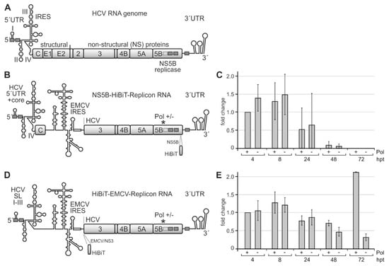 Figure 4C shows that HiBiT expression is maximal at 4 and 8 h after transfection. HiBiT translation decreases at 24 h after transfection and then drops to undetectable levels at 72 h due to degradation of the transfected RNAs in the absence of active replication, with no significant differences between the wild-type (wt) NS5B polymerase (Pol +) and the replication-deficient mutant (Pol−). Thus, the HiBiT tag insertion in the NS5B coding sequence obviously is deleterious for polymerase activity, and the observed HiBiT tag expression is only due to the translation of the transfected RNAs.