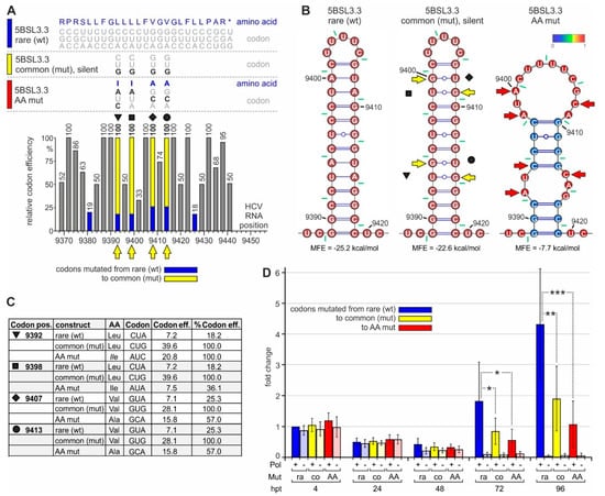The impact of rare codons on NS5B translation and HCV replication. (A) The C-terminal region of the HCV NS5B replicase coding region with amino acids and codons on the top (like in Figure 2. The wild-type (wt) 5BSL3.3 sequence is shown on top (color code: blue), and below the silent mutations from rare to efficient (common) codons (color code: yellow) and amino acid mutations (color code: red). The panel below shows the rare codon and mutated codon efficiencies. Symbols (as in Figure 2, Figures S2 and S3) indicate the mutated codons (emphasized by yellow arrows). (B) Predicted RNA secondary structures of the 5BSL3.3 wt (left), the mutant in which rare efficiency codons were mutated to common codons (middle), and the amino acid mutations (right). Yellow or red arrows indicate mutated nucleotides. (C) Details of the codon mutations. (D) HiBiT expression from the replicon RNA shown in Figure 4D with the mutations shown in Figure 5A–C.