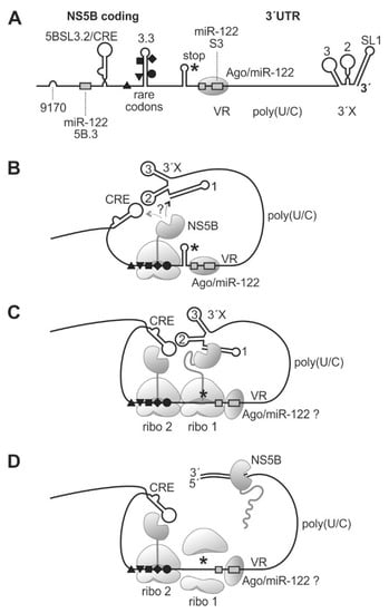In addition, a variety of regulatory elements is found, in particular, in the NS5B coding region at the end of the coding region [,,,,,,,]. The most prominent of these cis-regulatory RNA elements in the NS5B coding region is the cis replication element (CRE) (also called 5BSL3.2) that is required for replication []. Together with its upstream and downstream neighbor structures—5BSL3.1 and 3.3—the 5BSL3.2 can bind the NS5B replicase [,,,]. However, this RNA region can also bind the small ribosomal 40S subunit [], and it has been reported to be involved in translation regulation []. The 3′UTR is—in addition to its role in replication—involved in translation stimulation [,,], and it can also bind the ribosomal 40S subunit []. Moreover, the CRE/5BSL3.2 and the 3′X interact with each other by virtue of a so-called “kissing loop” interaction that involves the apical loop of the CRE and the SL 2 of the 3′X region (when present in its three-stem-loop form) [,,]. Thus—besides many other possible long-range RNA-RNA interactions [,]—this network of interactions involving the CRE region, the 3′X region, the NS5B replicase protein, and the ribosomal 40S subunit could be considered to be involved in the regulation of the transition from genome translation (that is required to produce the viral replication proteins) to the initiation of viral RNA replication.