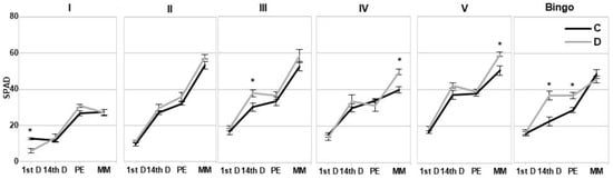 | Genotype × Treatment | 5.798 *** | 6.012 *** | 4.742 *** | 6.833 *** | 7.777 *** | 4.684 *** | 6.085 *** | 3.817 *** | 5.412 *** |