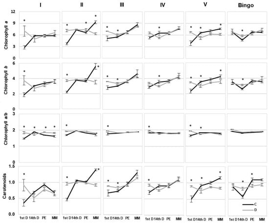 - Czyczylo-Mysza, I.; Tyrka, M.; Marcinska, I.; Skrzypek, E.; Karbarz, M.; Dziurka, M.; Hura, T.; Dziurka, K.; Quarrie, S.A. Quantitative trait loci for leaf chlorophyll fluorescence parameters, chlorophyll and carotenoid contents in relation to biomass and yield in bread wheat and their chromosome deletion bin assignments. Mol. Breed. 2013, 32, 189–210. [Google Scholar] [CrossRef]