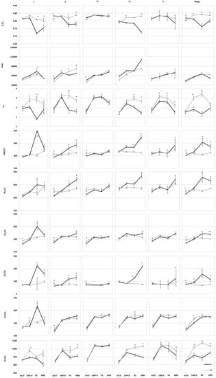| Genotype × Treatment × Term | 2.381 ** | 2.876 *** | 2.408 ** | 3.062 *** | 3.964 *** | 3.319 *** | 2.347 ** | 4.095 *** | 2.397 ** |