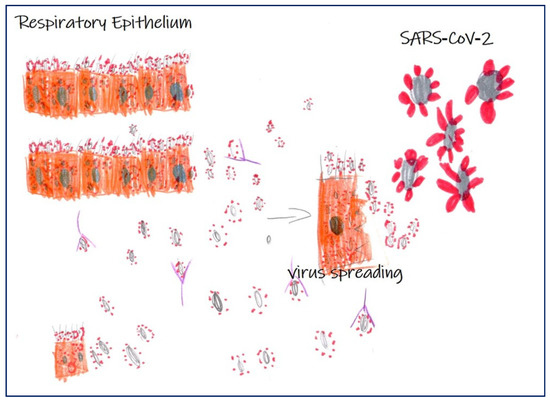 Scheme of severe acute respiratory syndrome coronavirus-2 (SARS-CoV-2) infection in respiratory epithelium. Image shows infection of SARS-CoV-2 in respiratory epithelium, virus spreading, and the antibody response (Martina Gioia Simeca, 5-year-old).