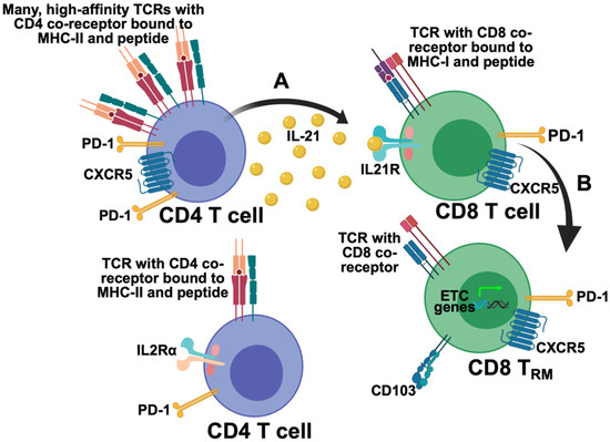 Further evidence that IL-21/IL21R signaling drives CD8 T cells toward a metabolic profile more consistent with TRM comes from our recent work using MuPyV brain infection to define requirements for bTRM differentiation [81]. As depicted in Figure 2B, IL21R signaling in CD8 T cells in the brains of MuPyV-infected mice drives expression of genes within the electron transport chain (ETC) [81]. Expression of these genes connotes engagement of oxidative metabolism. In line with these findings, CD8 T cells in lungs of influenza virus-infected CD4 T cell-deficient mice express fewer oxidative metabolism genes and genes in complex I of the ETC [48]. Yet to be determined is whether the CD4 T cell help for lung CD8 TRM during influenza virus infection is provided by IL-21.