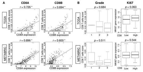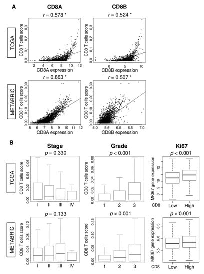 Association of CD8 T cells score with CD8A and CD8B gene expression and clinical aggressiveness in The Cancer Genome Atlas (TCGA) and Molecular Taxonomy of Breast Cancer International Consortium (METABRIC) cohorts. (A) Correlation between CD8 score and CD8A and CD8B gene expressions in both cohorts. Spearman correlation statistics was used for the analysis. * p < 0.01. (B) Boxplots of the CD8 score by AJCC cancer staging, Nottingham pathological grade, and comparison of low and high CD8 score groups with MKI67 gene expression in both cohorts. One-way ANOVA was used to calculate p value. A median of the CD8 T cells score was used to divide patients into low and high score groups.