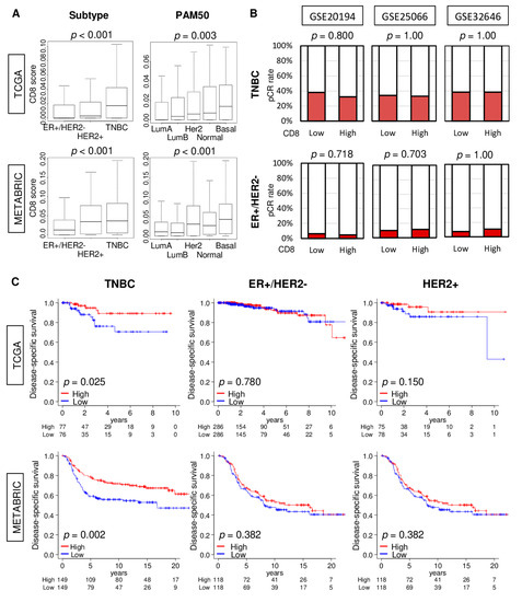 Since the degree of lymphocyte infiltration is known to differ between breast cancer subtypes, we investigated the distribution of the CD8 score among various subtype. In both TCGA and METABRIC cohorts, the CD8 score was significantly higher in TNBC subtype in which ER/PR/HER2 status was determined by IHC (Figure 2A; both p < 0.001), as well as in the basal subtype of PAM50 gene expression-based classification (p = 0.003, and p < 0.001, respectively).