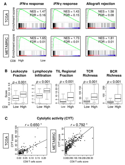 Gene Set Enrichment Analysis (GSEA) with the MSigDb Hallmark gene sets to high CD8 T cells score TNBC, association with multiple immune related scores, and correlation with cytolytic activity score (CYT) in TCGA and METABRIC cohorts. (A) GSEA of Hallmark IFN-α response, IFN-γ response, and Allograft rejection gene sets to high CD8 score TNBC in both cohorts, along with normalized enrichment score (NES) and false discovery rate (FDR). The statistical significance of GSEA was determined as FDR < 0.25. (B) Boxplots of comparison between low- and high-CD8 T cell score groups with immune-related scores; Leukocyte fraction, Lymphocyte infiltration, tumor infiltrating leukocyte (TIL) regional fraction, T cell receptor (TCR) and B cell receptor (BCR) richness score. (C) Correlation plots of CD8 score with CYT with spearman r and p value in both cohorts. * p < 0.01.