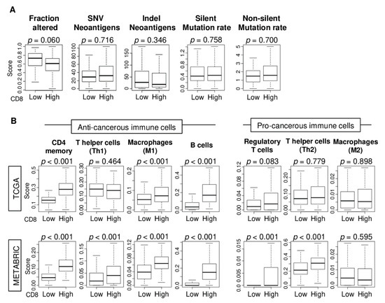 Mutation and neoantigen load as well as tumor infiltrating immune cell compositions by low and high CD8 T cells score of TNBC in the TCGA and METABRIC cohorts. Boxplots of comparison between low and high CD8 score groups with (A) mutation and neoantigen load scores; Fraction altered, single-nucleotide variant (SNV) and indel neoantigens, silent and non-silent mutation rate scores, and (B) Boxplots of comparison between low and high CD8 T cells score groups with infiltrating immune cell compositions using xCell algorithm. Anti-cancerous immune cells; CD4 memory T cells, T helper 1 cells (Th1), M1 macrophages, and B cells. Pro-cancerous immune cells; Regulatory T cells, T helper cells (Th2), and M2 macrophages. One-way ANOVA was used to calculate p value.