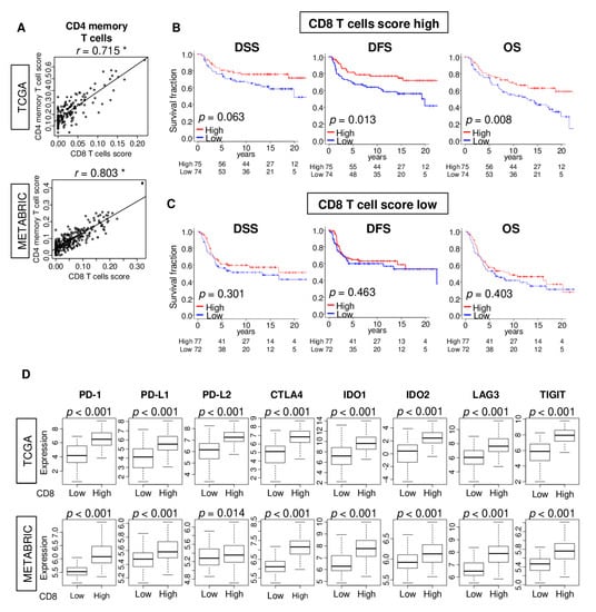 Associations of CD8 T cells score with CD4 memory T cells score and expression of immune checkpoint molecules. (A) Correlation plots of CD8 T cells score and CD4 memory T cells in TNBC of the TCGA and METABRIC cohorts. Spearman’s rank correlation critical value was used to the analysis. * p < 0.01. Kaplan–Meier plots of disease-specific (DSS), disease-free (DFS), and overall (OS) survival between low (blue) and high (red) CD4 memory T cell score groups in (B) high- or (C) low-CD8 score groups with log-rank p value. (D) Comparison of low and high CD8 T cells score groups in gene expression of immune checkpoint molecules in the TCGA and METABRIC cohorts. The one-way ANOVA was used to calculate p values. CTLA4, cytotoxic T-lymphocyte-associated protein 4; IDO1/2, indoleamine dioxygenase 1/2; LAG3, lymphocyte activation gene 3; PD-1, programmed death-1; PD-L1/2, programmed death ligand 1/2; TIGIT, tyrosine-based inhibitory motif domain.