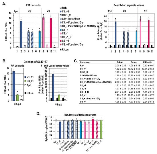 To examine whether the HCV core sequence comprising the SL47, SL87, and SL248 elements (Figure 1A) can direct internal translation initiation, we applied the previously reported dual Renilla-Firefly system Rph (Renilla-photinus hairpin, Figure 1B) [49,50,51,52]. In this bicistronic system, a DNA sequence potentially carries an IRES element when it is able to drive the efficient expression of the second cistron (Firefly luciferase, F-Luc) in an orientation-dependent manner. The Rph is an improved generation of bicistronic constructs that carries a stable hairpin loop (h) upstream of the first cistron (Renilla luciferase, R-Luc). The use of this RNA structure is a generally suggested strategy, ensuring that the translation of F-Luc is stringently controlled by the sequence inserted into the intergenic region and does not depend on the translation of the first cistron [53,54,55]. The hairpin is able to restrain the cap-dependent translation of R-Luc to minimal levels; however, these remain adequate for the normalization of transfection efficiency (Figure S1). Consequently, in the presence of the hairpin, the F-Luc/R-Luc ratio of an Rph construct carrying the HCV 5′-untranslated region (5′UTR) IRES in the intergenic region was increased up to 54-fold over background (empty vector Rph), whereas in the vector lacking the hairpin structure (Rp), the increase was only up to 10-fold (Figure S1). Furthermore, to rule out the initiation of F-Luc translation due to putative splicing or cryptic promoter activities in the inserted viral sequences [53,54,55], capped and polyA-tailed bicistronic RNAs were synthesized in vitro and transfected into Huh7 cells, without the removal of liposome–RNA complexes until cell lysis. F-Luc and R-Luc levels were measured from the Rph constructs at 8 h post-transfection initiation (h p.t) (Figure 2A,C), based on previous kinetic studies showing at this time-point the highest differences over background (Figure S2A,B). The ratios of F-Luc to R-Luc values (F/R) were also determined as shown below.