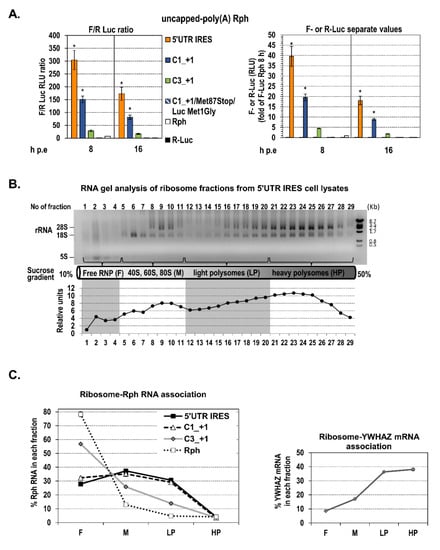 To examine the loading of ribosomes on the Rph bicistronic RNAs, polysome analysis was performed using sucrose density gradient ultracentrifugation. Huh7 cells were electroporated with in vitro transcribed uncapped polyA-tailed RNAs and seeded in 100 mm dishes. After 16 h, electroporated cells were washed twice with ice-cold PBS pH-7.4 containing 100 μg/mL cycloheximide (CXH) and lysed with 500 μL of polysomes lysis buffer containing 300 mM NaCl, 15 mM MgCl2, 15 mM Tris-HCl, pH 7.4, 100 μg/mL CXH, and 1% Triton-X 100. The cell lysates were collected, and nuclei were pelleted by centrifugation at 12,000× g for 10 min. The supernatants were layered on a linear 10–50% (w/v) sucrose gradient in polysome gradient buffer (300 mM NaCl, 15 mM MgCl2, 15 mM Tris-HCl, pH 7.4 and 100 μg/mL CXH) and centrifuged at 27,000 rpm for 4 h at 4 °C in a SW41 rotor (Beckman Coulter, Brea, CA, USA). Twenty-nine sucrose density gradient fractions of 400 μL were collected from the top, and the distribution of ribosomal RNA along the fractions was determined by agarose gel electrophoresis and quantified by Quantity One software (Bio-Rad, Hercules, CA, USA). The fractions were pooled as follows: samples 1–4 (free ribonucleoprotein complexes), samples 5–11 (40S, 60S and 80S monosomes), samples 12–20 (light polysomes), and samples 21–29 (heavy polysomes). Total RNA was extracted from the sucrose density fractions using acidic phenol/chloroform as described above for in vitro transcribed RNA. The distribution of the free and ribosome associated Rph RNA was determined with RT-qPCR, using F-Luc specific primers as described above.