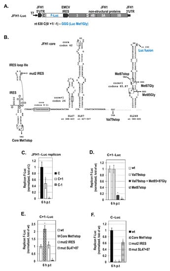 Recently, we reported that core+1 ORF is expressed in the context of a bicistronic JFH1-based replicon when fused with the N-terminus of the F-Luc gene and demonstrated the production of two isoforms, core+1/L (long) and core+1/S (short), with different kinetics [18]. The core+1/S protein expression is predominant at an early point in time in the viral replication cycle, with the highest levels at 6 h post-transfection [18], which coincides with the time-point of viral RNA translation peak [56]. Based on the above data, we aimed to clarify the role of SL47 and SL87 on core+1/S expression in the context of the viral replicon [18] (Figure 5A). Luciferase tagging stabilizes the highly unstable core+1/S protein [15], and it provides a quantitative measure of the translation efficiency of core and core+1 ORFs (C‒Luc and C+1‒Luc, respectively). C−1‒Luc replicon was used as negative control, as the core−1 frame is not open for translation. In these replicons, the F-Luc initiator AUG has been mutated to GGG to exclude any translation initiation from this codon. Using this construct, we performed the following series of experiments: