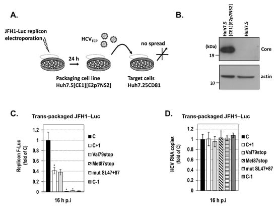Core+1/S expression in the context of JFH1 replicon after infection with trans-complemented (TCP) viral particles. (A) Experimental setup to create trans-complemented HCV particles (HCVTCP) encapsidating subgenomic JFH1-Luc replicons in the stable cell line Huh7.5[CoreE1][E2p7NS2]. (B) Analysis of the CoreE1 transgene expression in electroporated with the JFH1-Luc replicon packaging cells by Western blotting using HCV core- and actin-specific antibodies. (C,D) Infection of Huh7.25-CD81 target cells by HCVTCP viral particles generated upon the electroporation of Huh7.5[CoreE1][E2p7NS2] cells with one of the subgenomic JFH1-Luc replicons C, C+1, C−1, C+1/Val79stop (Val79stop), C+1/Met87stop (Met87stop), or C+1/mut SL47+87 (mut SL47+87). At 16 h post-infection (p.i.), luciferase activity levels derived from the subgenomic replicons were determined, and the intracellular HCV positive strand RNA copies were quantified by RT-qPCR. Three independent experiments were performed. Values are means ± SD, * p < 0.001 cells transfected with C+1 replicon vs. C, and mutated C+1 replicons with Met87stop and mutSL47+87 vs. the wild-type one (Student’s t test).