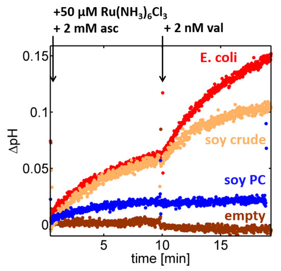 In order to probe the impact of the lipid composition, related experiments were conducted using proteoliposomes formed through reconstitution of the enzyme into either the polar extract of E. coli, a lipid composition often used in the reconstitution of heme-copper oxidases [26,28], or into soybean PC, which is the major constituent of the soybean crude extract. For CcO reconstituted in a crude lipid fraction of soybean lipids, the proton turnover saturated at a pH gradient of ~0.07 pH units prior to valinomycin addition and at ~0.1 pH units afterwards (cf. Figure 2, orange trace). Surprisingly, the saturation values dropped considerably when a lipid composition consisting of 95% soybean phosphatidylcholine (PC) was used instead (Figure 2, blue trace), while a similar performance was observed using the polar extract of E. coli (Figure 2, red trace). Although in all cases the nominal concentration ratio of enzymes per liposome was fixed at 10:1 in the reconstitution step, changes in the lipid composition generated different pH traces in the spectrofluorometric setup, which is indicative of an impact of the lipid composition on either the reconstitution efficiency of CcOs (number of active enzymes per liposome), the proton turnover rate of single CcO, changes in the proton permeability of the liposomes, or combinations of these effects.