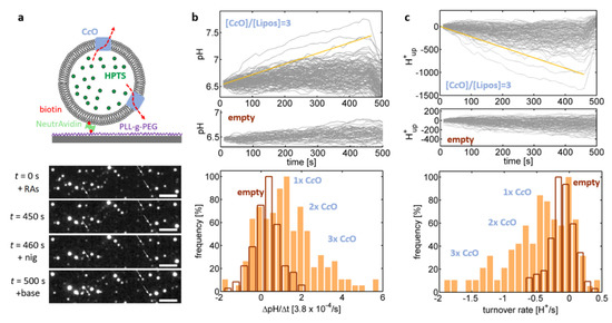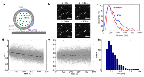 Although the cuvette-based assay supports rapid determination of such differences between different lipid compositions, it cannot be used on its own to determine the CcO proton turnover rate. As the proteoliposomes show a notable variation in size and number of (actively) reconstituted enzymes, the ensemble-averaged pH trace is a superposition of several proteoliposome populations and thus depends in a complex way on various parameters. In light of this finding, probing luminal pH values on the level of single liposomes using fluorescence microscopy proved to be a potent approach to analyze the activity of single proton pumps [26,27,28]. In this approach, the proteoliposomes are linked to a glass interface and fluorescence microscopy is used to quantify the individual change in fluorescence emission of single, interface-bound proteoliposomes. This concept was realised in the present study by complementing the lipid composition of the liposomes with DPSE-PEG-biotin lipids, which allowed for linking the biotinylated proteoliposomes to a biotinylated glass interface by means of the highly specific biotin-(Neutr)Avidin interaction (Figure 3a) [28]. The luminal pH value of single, isolated liposomes was determined through excitation of HPTS present inside the liposomes at 458 nm and imaging the fluorescence emission of the interface-bound liposomes at 520 nm.