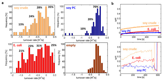 The following are available online at https://www.mdpi.com/1422-0067/21/19/6981/s1, Figure S1: Size distributions of the generated proteoliposomes, Figure S2: Proton turnover rate distributions for proteoliposomes made from a crude extract of soybean lipids.