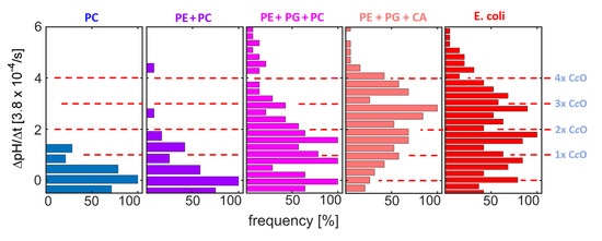 Pumping was observed for all measurements using the synthetic lipid compositions. A linear increase in pH vs. time, similar to the one reported in Figure 4, allowed for determining the rate of pH change (ΔpH/Δt). The ΔpH/Δt distributions obtained here (Figure 6) show equidistant peaks for most lipid compositions. The positions of the peaks reproduce well among compositions (red dashed lines in Figure 6). As in the experiments employing native compositions reported above (Figure 4), these peaks are attributed to proteoliposome subpopulations with different numbers of functionally reconstituted CcOs (as indicated at the red dashed lines in Figure 6). Comparing the protein distributions between the synthetic compositions, a clear impact of PG and CA on the efficiency of functional reconstitution is observed, while addition of PE caused only minor changes to the distribution.