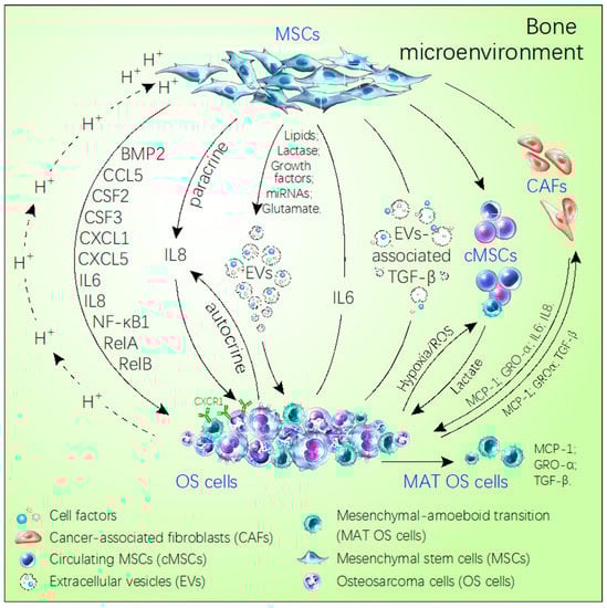 Schematic diagram of the cross-talk between MSCs and OS cells in the bone microenvironment. MSCs directly secrete some factors or choose the extracellular vesicles as the carrier to transport miRNAs, growth factor, lipids, glutamate, lactase, which promote OS metastasis. Meanwhile, OS utilizes the acidic environment, hypoxia and extracellular vesicles inducing the MSCs secreting cell factors to facilitate their own growth and metastasis, like IL-8, IL-6, RelA, RelB, NF-κB1, CSF2/GM-CSF, CSF3/G-CSF, BMP2, CCL5, CXCL5, CXCL1. In addition, OS via secreted MCP-1, GRO-α, and TGF-β induces MSCs trans-differentiating the cancer-associated stem cells to express more MCP-1. GRO-α, IL-6, and IL-8 promote the MAT of OS. The solid arrows refer to the direction of the cell or factor from the MSCs. The dotted arrows refer to the direction of cells and factors from OS.