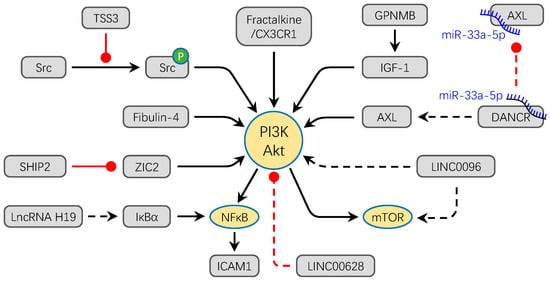 The PI3K/Akt signaling pathway converges to facilitate the progression OS. Most factors directly activate PI3K/Akt signaling pathway to promote the migration and invasion of OS. For example, overexpression of Fibulin-4, Fractalkine/CX3CR1, ZIC2, LINC0096, and lncRNA H19 promote the osteosarcoma metastasis through the activation of PI3K/Akt signal pathway. Meanwhile, GPNMB and DANCR/miR-33a-5p activate the PI3K/Akt pathway by promoting the expression of IGF-1 and AX, respectively. TSSC3 inhibits the phosphorylation of Src to activate the PI3K/Akt signaling pathway. Conversely, overexpression of LINC00628 inhibits the phosphorylation of PI3K and Akt. The solid lines refer to protein molecules and the dotted lines refer to non-coding RNAs in this figure. Black arrows show the promotion of molecules, while red dots show the inhibition of molecules.
