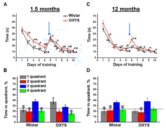 Morris ware maze (MWM) performance of OXYS and Wistar rats at 1.5 and 12 months of age. Time required for finding a submerged platform on subsequent training days for OXYS and Wistar rats at 1.5 months of age (A) and 12 months of age (C). In the probe trial, 1.5-month-old Wistar rats preferred the target third quadrant, whereas OXYS rats remembered the previous location of the platform in the first quadrant (B). At 12 months of age, Wistar rats preferred the target third quadrant to all other quadrants; this was not the case for OXYS rats (D). The data are presented as mean ± SEM, n = 8. * p < 0.05 for differences between the strains; ^ p < 0.05 for a comparison with the first day of testing; # p < 0.05 for a comparison with the sixth day of testing; @ p < 0.05 for a comparison with time in the third quadrant. The arrow indicates the move of the platform from the first to third quadrant. The black line (B,D) indicates the average time the rats should spend in each quadrant without training.