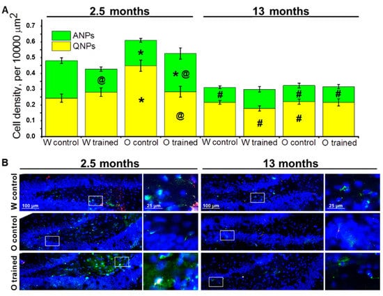 Neuronal progenitors’ density in the dentate gyrus (DG) of OXYS and Wistar rats. (A) The density of quiescent neural progenitors (QNPs) was higher in 2.5-month-old OXYS rats than in Wistar rats, and training in the MWM decreased this parameter in OXYS rats to the level of Wistar rats. The density of ANPs at 2.5 months of age was lower in OXYS rats compared to Wistar rats, and the training in the MWM lowered the parameter in young Wistar rats but increased it in young OXYS rats. The data are presented as mean ± SEM, n = 3 to 6. * p < 0.05 for differences between the strains; # p < 0.05 for a comparison with the previous age; @ p < 0.05 for effects of the MWM training. W: Wistar rats; O: OXYS rats. (B) Photomicrographs of the DG of control Wistar and OXYS rats, as well as trained OXYS rats at ages 2.5 and 13 months are shown as representative images of immunohistochemical staining with antibodies against nestin (green) and vimentin (red). DAPI (blue) highlights cell nuclei.