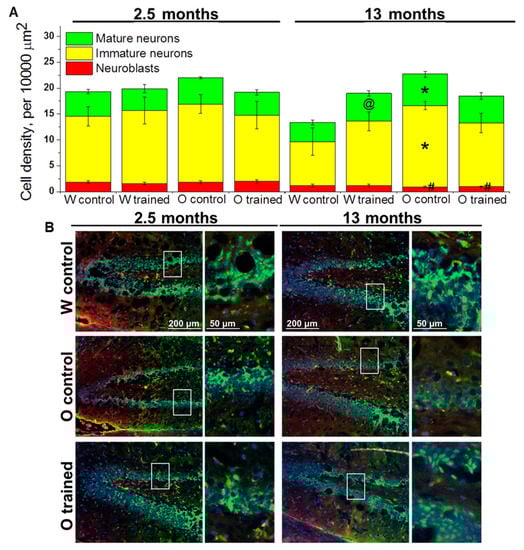 The second stage of our work was aimed at the evaluation of the influence of MWM training on neurogenesis in the hippocampal DG via determination of densities of progenitors and immature and mature neurons and astrocytes at 4 weeks after the beginning of the MWM training. Therefore, the age of the rats advanced to 2.5 and 13 months; nontrained age-matched animals served as a control.