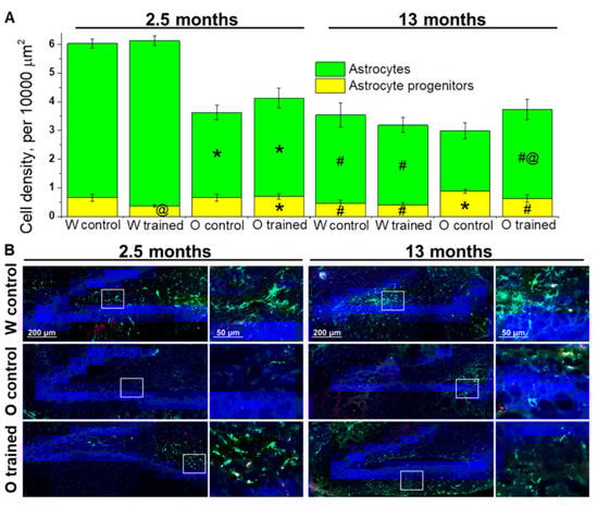The estimation of astrocyte progenitors’ density in the DG revealed that this parameter was affected by genotype (F1.64 = 11.4, p < 0.001) and training (F1.64 = 4.1, p < 0.05). We did not notice any age-related changes in astrocyte progenitors’ density; however, a slight decrease of the parameter from 2.5 to 13 months of age in Wistar rats and a slight increase of the parameter in OXYS rats caused higher density of astrocyte progenitors in the DG of 13-month-old OXYS rats (p < 0.004; Figure 4A). As for effects of MWM performance on astrocyte progenitors’ density, we registered a decrease of this parameter in 2.5-month-old Wistar rats (p < 0.03; Figure 4A).