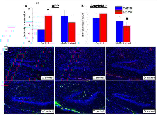 Mean immunofluorescence intensity of APP and amyloid-β in the DG of OXYS and Wistar rats at age 13 months. The load of APP (A) was higher in OXYS rats than in Wistar rats. MWM training did not affect APP content but decreased levels of amyloid-β (B) in OXYS rats. The data are presented as mean ± SEM, n = 6. * p < 0.05 for differences between the strains; # p < 0.05 for effects of the MWM training. W: Wistar rats; O: OXYS rats. (C) Photomicrographs of the DG of untrained Wistar and OXYS rats and a trained OXYS rat are shown as representative images of immunohistochemical staining with antibodies against APP (red) and amyloid-β (green). DAPI (blue) highlights cell nuclei. The scale bar (C) is 200 μm.