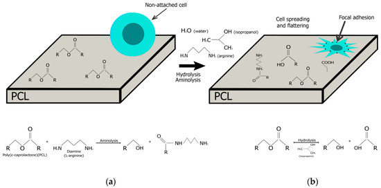 Schematic presentation of chemically based reaction to introduce reactive amine groups on the surface of polymers. Polycaprolactone (PCL) treatment with diamine (L-arginin), resulting in the production primary amines on the material surface (a); PCL hydrolysis causing the polymer to break into two components (b).