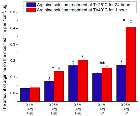 The dependence of the arginine amount on the modified film per 1 cm2 on the solution concentration (water (H2O) or isopropanol (IP)) at T = 40 °C and T = 25 °C. (n = 5: *—p < 0.02 for the same concentration data, **—p < 0.05; #—p < 0.02 compared with lower concentration, but the same temperature).