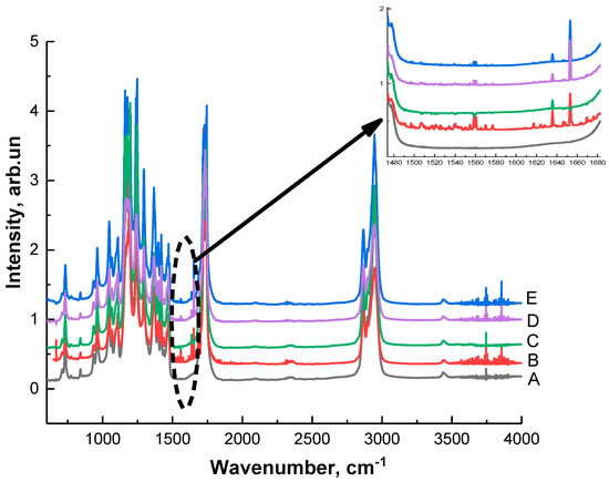 Figure 3 shows the Fourier transform infrared (FTIR) spectra of the pristine PCL (A), PCL modified by arginine solutions with different concentrations in water or in solutions from water, and isopropanol at room temperature and with heating. FTIR spectra of PCL films treated with a 0.1 M arginine solution in water at room temperature and heating did not differ from the control; therefore, they are not shown in this figure. For the pure PCL film, we can see the characteristic peaks for carbonyl groups at 1720 cm−1 (n(C=O)) and aliphatic groups at 2947 (nas(C–H)) and 2865 cm−1 (ns(C–H)). After aminolysis treatment, FTIR spectra of modified PCL films have two additional peaks in the range 1510–1580 cm−1, which are assigned to amide II and mainly associated with N–H bending vibrations. The second peaks in the range 1600–1700 cm−1 corresponds to amide I, and it is mainly connected with a C=O (carbonyl) stretching vibration (70–85%) and C–N group vibrations (10–20%) [23,24]. The results of FTIR analysis confirm the previously obtained results of the ninhydrin reaction.