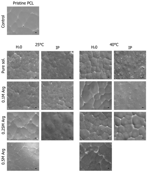 Scanning electron microscopy (SEM) images of PCL films; unmodified PCL film; film treated with 0.1 M arginine solution for 1 h at T = 40 °C; film treated with 0.25 M arginine solution for 1 h at T = 40 °C; film treated with 0.5 M arginine solution for 1 h at T = 40 °C; film treated with 0.1 M arginine solution for 24 h at T = 25 °C; film treated with 0.25 M arginine solution for 24 h at T = 25 °C; film treated with the 0.5 M arginine solution for 24 h at T = 25 °C. Scale bar 100 µm.