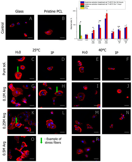 Fluorescence micrographs of Mesenchymal stem cells (MSCs) with actins (red) and nuclei (blue) stained after 2 h cultivation: (A) on the pure glass, (B) on the pristine PCL, (C) on the film treated with water for 24 h at T = 25 °C, (D) on the film treated with water/isopropanol (3:1) for 24 h at T = 25 °C, (E) on the film treated with water for 1 h at T = 40 °C, (F) on the film treated with water/isopropanol (3:1) for 1 h at T = 40 °C, (G) on the film treated with the 0.1 M arginine solution in water for 24 h at T = 25 °C, (H) on the film treated with the 0.1 M arginine solution in water/isopropanol (3:1) for 24 h at T = 25 °C, (I) on the film treated with the 0.1 M arginine solution in water for 1 h at T = 40 °C, (J) on the film treated with the 0.1 M arginine solution in water/isopropanol (3:1) for 1 h at T = 40 °C, (K) on the film treated with the 0.25 M arginine solution in water for 24 h at T = 25 °C, (L) on the film treated with the 0.25 M arginine solution in water/isopropanol (3:1) for 24 h at T = 25 °C, (M) on the film treated with the 0.25 M arginine solution in water for 1 h at T = 40 °C, (N) on the film treated with the 0.25 M arginine solution in water/isopropanol (3:1) for 1 h at T = 40 °C, (O) on the film treated with the 0.5 M arginine solution in water for 24 h at T = 25 °C, (P) on the film treated with the 0.5 M arginine solution in water for 1 h at T = 40 °C, Statistics of cell adhesion on surfaces with different functional groups after 2 h cultivation. (n = 5: *—p < 0.01, **—p < 0.05 for the same concentration data, #—p < 0.01, ##—p < 0.05 compared with the unmodified PCL). Scale bar 50 µm.