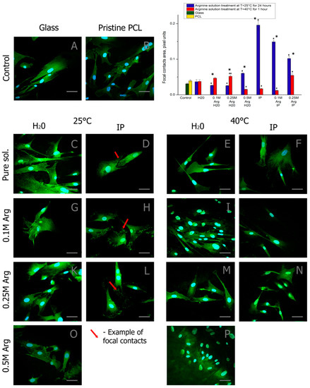 Fluorescence micrographs of MSCs with vinculin (green) and nuclei (blue) stained after three days of cultivation: (A) on the pure glass, (B) on the pristine PCL, (C) on the film treated with water for 24 h at T = 25 °C, (D) on the film treated with water/isopropanol (3:1) for 24 h at T = 25 °C, (E) on the film treated with water for 1 h at T = 40 °C, (F) on the film treated with water/isopropanol (3:1) for 1 h at T = 40 °C, (G) on the film treated with the 0.1 M arginine solution in water for 24 h at T = 25 °C, (H) on the film treated with the 0.1 M arginine solution in water/isopropanol (3:1) for 24 h at T = 25 °C, (I) on the film treated with the 0.1 M arginine solution in water for 1 h at T = 40 °C, (J) on the film treated with the 0.1 M arginine solution in water/isopropanol (3:1) for 1 h at T = 40 °C, (K) on the film treated with the 0.25 M arginine solution in water for 24 h at T = 25 °C, (L) on the film treated with the 0.25 M arginine solution in water/isopropanol (3:1) for 24 h at T = 25 °C, (M) on the film treated with the 0.25 M arginine solution in water for 1 h at T = 40 °C, (N) on the film treated with the 0.25 M arginine solution in water/isopropanol (3:1) for 1 h at T = 40 °C, (O) on the film treated with the 0.5 M arginine solution in water for 24 h at T = 25 °C, (P) on the film treated with the 0,5 M arginine solution in water for 1 h at T = 40 °C. Statistics of cell adhesion on surfaces with different functional groups after 1 day cultivation. (n = 5: *—p < 0.01, for the same concentration data, #—p < 0.01, ##—p < 0.05 compared with the unmodified PCL). Scale bar 50 µm.
