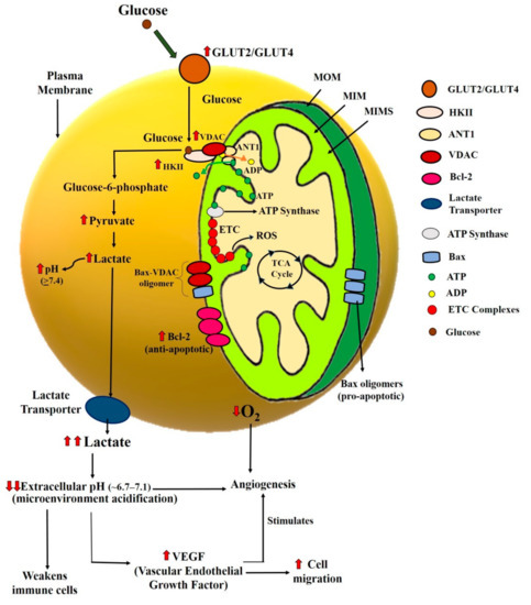 The hyperactivated H+/monocarboxylate cotransporters export the lactate out of these cells [57] and acidify the cancer cells’ cellular microenvironment. This further leads to the weakening of the immune cells, increases the expression of vascular endothelial growth factor (VEGF), and thus stimulates the angiogenesis and cell migrations [57]. Angiogenesis is the lifeline for the cancer cell because it would supply oxygen for their growth and proliferation.