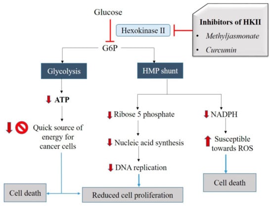 Schematic representation of the inhibitory effect of herbal mitocans on HKII. Inhibition of HKII may inhibit the conversion of glucose to G6P and interfere with the process of glycolysis as well as HMP shunt, leading to the cytostatic/cytotoxic effect on cancer cells. Methyl jasmonate and curcumin can be cytostatic by reducing cell proliferation and cytotoxic by killing the cancer cells.