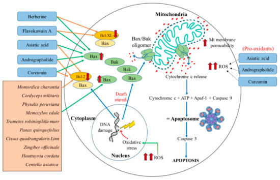 Schematic representation of natural agents’ role inducing apoptosis via increasing the level of pro-apoptotic Bax and decreasing the level of anti-apoptotic Bcl-2/Bcl-XL. Death stimuli due to damage in the DNA activates Bax. Activated Bax forms a homo/heterooligomer, whose pore-like structure channelizes the release of cytochrome c. The mitochondrial membrane permeability increases, which, in turn, allows increased cytochrome c release. Cytochrome c, ATP, Apaf-1, and caspase-9 form an apoptosome complex that further activates caspase-3 and leads to apoptosis. Possible natural mitocans flavokawain A, berberine downregulated the Bcl-XL and upregulated the Bax. On the other hand, asiatic acid and andrographolide decreased the expression of Bcl-2 and increased the expression of Bax and the ROS level. Crude extracts of Momordica charantia, Cordyceps militaris, Physalis peruviana, Memecylon edule, Trametes robiniophila murr, Panax quinquefolius, Cissus quadrangularis Linn, Zingiber officinale, Houttuynia cordata, and Centella asiatica increased the expression of Bax and decreased the expression of Bcl-2 proteins.