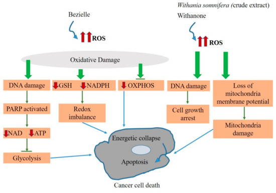 Schematic representation of the anti-cancer effects of some selected natural agents or extracts by influencing the ROS levels in cancer cells. Bezielle elevates the level of ROS in the cancer cell and causes redox imbalance, as well as inhibiting glycolysis and OXPHOS. Similarly, the methanolic extract of Withania somnifera and its bioactive compound withanone also elevated the ROS level in the cancer cell, causing cell growth arrest and mitochondria damage. As a consequence of redox imbalance, inhibition of the energy-producing pathways (glycolysis and OXPHOS) and mitochondrial damage may cause energetic collapse and apoptosis.