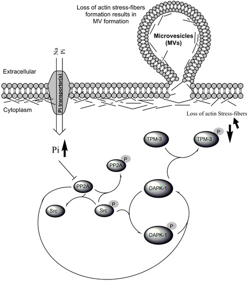 Diagram of proposed Pi-induced PP2A/Src/DAPK-1/TPM-3 signaling pathway. While hyperphosphorylation of TPM-3 (as the supporting link between TMP-3 and the cytoskeleton) [31] is associated with an enhanced actin stress-fibre formation and works as a protective mechanism in maintaining cell membrane integrity, hypophosphorylation of TPM-3 may result in loss of actin stress-fibres and be associated with membrane blebbing/MV generation from the cells. NB: Pi transporters include Na+-Linked PiT-1 (slc20a1) and PiT-2 (slc20a2), with the former the main Pi transporters in endothelial cells (ECs) (described in detail in the Introduction).