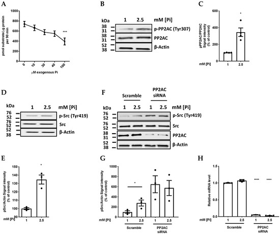 To demonstrate that the Pi-induced promotion of PP2A-C phosphorylation (and hence inhibition of its activity) was giving the predicted phospho-activation of Src, Western blotting was performed using an antibody against p-Src (Tyr419). This showed that 2.5 mM extracellular [Pi] acutely induced hyperphosphorylation of Src at Tyr419 within 1.5 h in cultures of EA.hy926 ECs (Figure 2D,E). To confirm that this was mediated by PP2A inhibition, siRNA silencing of PP2A-C gene expression was performed using an siRNA which efficiently knocked down PP2A-C expression both at the protein level (Figure 2F,G) and at the mRNA level (Figure 2H). This strongly increased p-Src (Tyr419), indicating that in these cells, this phosphatase does exert the previously described [21] indirect stimulatory effect on Src phosphorylation (Figure 2F). As expected, silencing of PP2A-C expression abolished the effect of Pi on Src phosphorylation but, in the presence of an irrelevant scrambled siRNA sequence, a significant (~3-fold) Pi-induced stimulation of Src phosphorylation was still observed (Figure 2F).