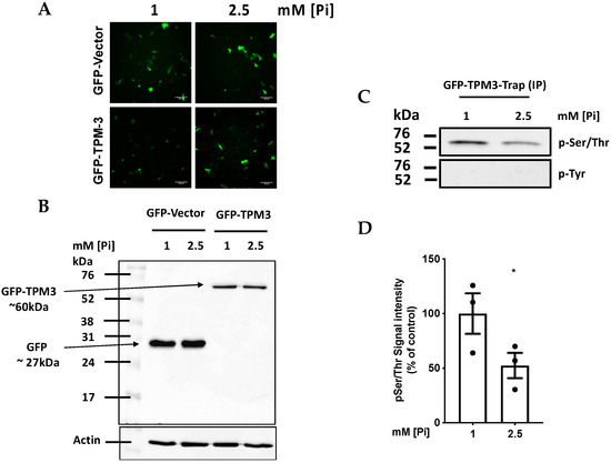 The data on DAPK-1 silencing imply that this kinase is acting on a target protein which plays an important role in cytoskeleton function and hence MV output. The cytoskeletal regulatory protein TPM-3 (which is the predominant Tropomyosin isoform expressed in EA.hy926 cells [10]) has 7 Serine (Ser) and 3 Threonine (Thr) residues that could potentially be phosphorylated by the serine-threonine kinase DAPK-1, and hence show hypophosphorylation when DAPK-1 is inhibited. To investigate the hypothesis that Pi induces hyphophosphorylation of TPM-3, ECs were transfected with plasmids expressing GFP-tagged wild-type TPM-3 or control GFP plasmid. Transfected cells were then treated with 1 or 2.5 mM [Pi] for 1.5 h, and then the expression of free GFP or the GFP-TPM-3 fusion protein was confirmed by fluorescence microscopy (Figure 4A) and by Western blotting with anti-GFP antibody (Figure 4B). The GFP-TPM-3 fusion protein was then pulled-down from cell lysates by GFP-Trap®. Western blotting of the GFP-Trapped proteins using pan-specific antibodies against phospho-Ser/Thr and phospho-Tyr demonstrated Serine and/or Threonine phosphorylation within the GFP-TPM-3 protein, and reproducible hypophosphorylation under high Pi conditions (Figure 4C,D). No Tyr phosphorylation was detected.