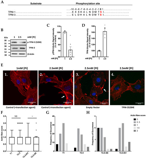 Pi-induced hypophosphorylation of cytoskeletal regulatory protein (TPM-3) resulting in the loss of actin stress-fibre formation which is reversed by overexpression of pseudophosphorylated TPM-3 mutant. (A) Sequence alignment of human TPM-1 and TPM-3 showing the amino acid sequence around the phosphorylation site of TPM-3 at the C-terminus. (B) p-TPM-3 (S284) and total TPM-3 representative immunoblots obtained from cell lysates using antibodies against TPM-3, and p-(S284)-TPM-3 after treatment of the cells with 1 or 2.5 mM Pi for 1.5 h. (C,D) Blots were quantified by densitometry (n = 3, * p = 0.0337, ** p = 0.0095). (E) High Pi-induced hypophosphorylation of TPM-3 after treating the cells with 1 or 2.5 mM [Pi] for 1.5 h is associated with the loss of actin stress fibre formation, but accumulation of cortical actin deposits (Panel 2). In contrast, cultures transfected with plasmid overexpressing pseudophosphorylated TPM-3 mutant (TPM-3S284E) show partial restoration of stress fibres in the presence of 2.5 mM Pi (Panel 4). After cells were treated with 1 or 2.5 mM [Pi] for 1.5 h, they were fixed and stained for F-actin using Alexa-Fluor-594-phalloidin and DAPI and then were examined by confocal microscopy. White arrows show formation of dense actin deposits in the cortical region of the cell. (F–H) A quantification from the above experiments was performed (n = 3, ** p = 0.0021) as detailed in the experimental procedures section. SE: pseudophosphorylated TPM-3 mutant, EV: Empty Vector, NS: Not significant. Actin fibre score data in (F) are presented as box and whisker plots.