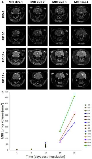 Tumor evolution and deformation of the brain over time. (A) Deformation of the brain over time. This figure shows consecutive (MRI slice 1 to 4, posterior to anterior) T2 MRI images (slice thickness: 0.6 mm—interslice thickness: 1.2 mm) in a rat brain at different time points: PID6: Hyperintense T2 signal at inoculation site (GB9); PID10: three distinct tumor zones can be identified (GB5); PID14: large tumor starts to deform the brain (GB14); PID19: massive tumor deforms the brain, pushes on the brainstem, and causes a midline shift (GB14). T2 MRI images “MRI slice 2” are taken around the inoculation site, while T2 MRI images “MRI slice 4” are taken close to the electrodes implanted in the hippocampi. PID—post-inoculation day. * indicates that images of PID14 and PID19 are obtained in the same GB animal (GB14). (B) Tumor volumes on MRI for different GB rats in function of time. In this graph, MRI tumor volumes for individual rats are shown for different points in time (days post-inoculation). Note that overlay of rats is present on PID6 (GB6–7 and GB8–9) and PID8 (GB11–12). Lines connect MRI tumor volumes of the same rats at different time points.