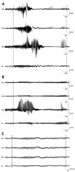 Examples of seizures on EEG. (A) representative spontaneous stage 1 seizure at PID15 in GB5. (B) representative spontaneous stage 1 seizure at PID20 in GB5. (C) representative spontaneous stage 5 seizure at PID6 in C1. Dashed lines indicate beginning and end of the seizures. The first channel represents EEG recorded from the ipsilateral dentate gyrus (DGi), the second channel EEG recorded from the ipsilateral CA1 (CA1i), the third channel EEG recorded from the contralateral dentate gyrus (DGc), and the fourth channel EEG recorded from the surface electrode at the tumor border (Cp).