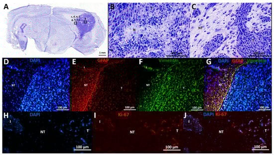 Histological and immunohistochemical analysis. (A–C) Cresyl violet staining: (A) This overview picture shows a tumor-containing coronal slice stained with cresyl violet. Tumor tissue can be clearly identified on the right of the slice, appearing dark purple as opposed to less intense stained normal brain tissue. (B) Cresyl violet staining in tumor tissue, 20× magnification: This figure shows a necrotic spot surrounded by palisading tumor cells (N), as well as nuclear atypia and marked hypercellularity. (C) Cresyl violet staining at tumor border, 20× magnification: This figure shows the transition from tumor (T) to non-tumor (NT) tissue, including an infiltrative spot (I). (D–G) Expression of GFAP and vimentin: (D) DAPI staining: Tumor tissue contains more densely packed cells compared to neighboring non-tumor tissue, as demonstrated by DAPI positive nuclei. (E) GFAP staining: GFAP labeling is mainly found at tumor border and diffuse in tumor tissue. (F) Vimentin staining: Vimentin labeling is found at tumor border and diffuse in tumor tissue. (G) DAPI, vimentin, and GFAP overlay: Many double positive cells align at tumor border. (H–J) Expression of Ki-67: (H) DAPI staining. (I): Ki-67 staining. (J): DAPI and Ki-67 overlay: Ki-67 positive cells are seen in tumor tissue and infiltrative spots, whereas most cells in adjacent non-tumor tissue are Ki-67 negative. T—tumor tissue; NT—non-tumor tissue; I—infiltrative spot; N—necrotic spot.