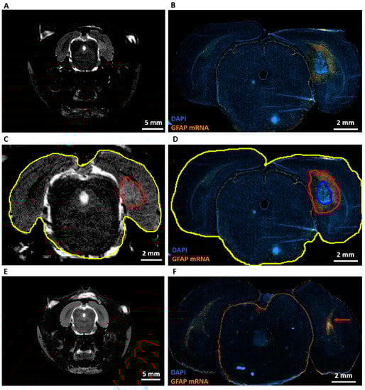 Expression of GFAP mRNA and comparison with MRI. (A) Representative T2 MRI image of a GB rat on PID8. A homogeneous hyperintense zone can be identified ipsilateral of the inoculation site. (B) Representative RNAscope image of the same GB rat on PID9. This image shows a large tumor (strong DAPI staining) surrounded by high level of GFAP mRNA expression. (C) Alignment of the hyperintense zone (red) and whole brain (yellow) on the T2 MRI image of a GB rat on PID8. Relative size of the hyperintense zone is calculated by dividing its area by the total area of the brain slice on MRI. (D) Alignment of tumor (blue) and tumor + rim of strong GFAP mRNA expression (red). Relative areas are calculated by dividing the blue and red area by the total area of the brain slice on the RNA scope image (yellow). (E) Representative T2 MRI image of a control rat (C4) on PID8. (F) Representative RNAscope image of C4 on PID9. The red arrow indicates the injection tract, in which there is an increase in GFAP mRNA expression.