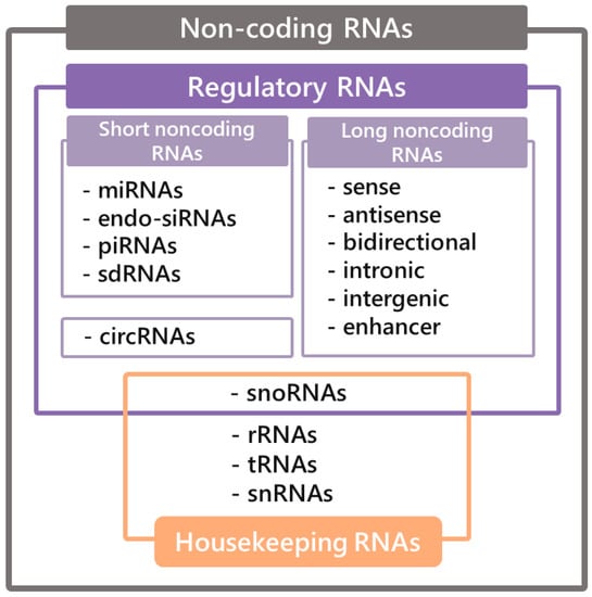 The history of ncRNAs dates back to 1965, when the first report elucidating the structure of alanine tRNA was provided [48]. This finding was followed by the subsequent discovery of snoRNAs, lncRNAs, miRNAs, and many more [49]. The application of the high-throughput sequencing method allowed the discovery of a wide range of ncRNAs and the conclusion that they constitute the majority of all genetic information. The classification of ncRNAs includes two groups, namely housekeeping RNAs, which are essential for maintenance of basic cellular function and constitutively expressed and regulatory RNAs. Regulatory RNAs can be further divided, depending on their length, into short ncRNAs for transcripts shorter than 200 nt and long ncRNAs, which are more than 200 nt in length (Figure 1) [50].