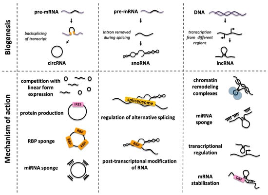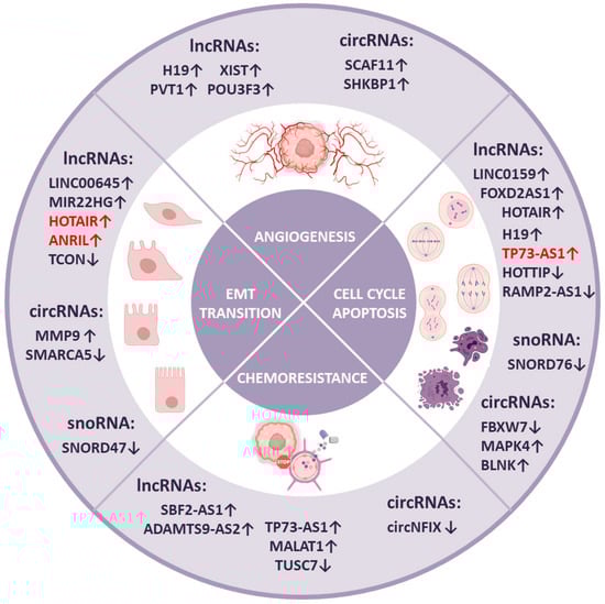 During the development of new molecular tools that made the exploration of the structures, functions, and cellular location of ncRNAs possible, it became clear that these particles play a significant role in cancer progression. The best known and examined group of ncRNAs remains microRNAs, which can act both as oncogenes and as tumor suppressors by inhibiting the expression of the crucial genes in the pathways that supervise cell processes, including cell cycle, apoptosis, and migration [51]. When miRNAs highly overexpressed in different types of cancer (oncomiRs) were discovered, it soon became evident that there are many more essential groups of ncRNAs responsible for cancer progression, three of which are lncRNAs, circRNAs, and snoRNAs, as presented below.