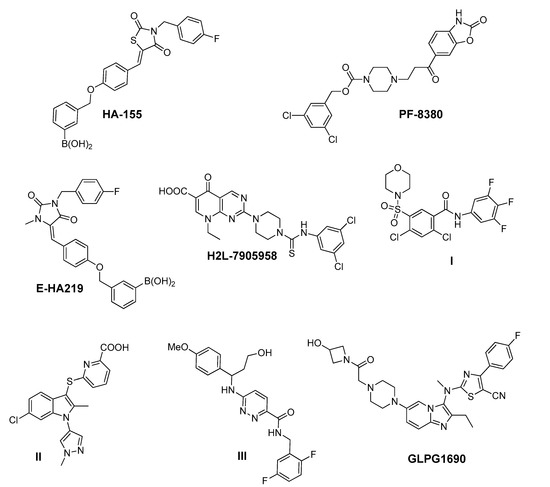 - Nikolaou, A.; Kokotou, M.G.; Limnios, D.; Psarra, A.; Kokotos, G. Autotaxin inhibitors: A patent review (2012–2016). Expert Opin. Ther. Pat. 2017, 27, 815–829. [Google Scholar] [CrossRef]
